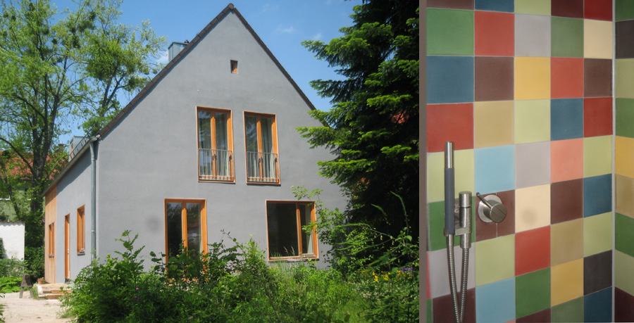 Der massive Gebäudeteil wurde grundlegend renoviert und erhielt einen grauen Wärmeschutzputz, der einen angenehmen Kontrast zur Holzschalung des Anbaus bildet.